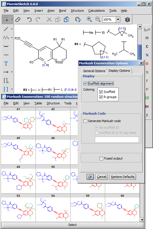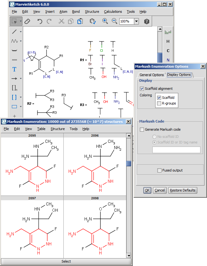The Markush enumeration plugin can be used to generate a whole or a subset of the library of a generic Markush structure. It is also capable of calculating the total number of specific structures present in a Markush library. The plugin is accessible from the followings: